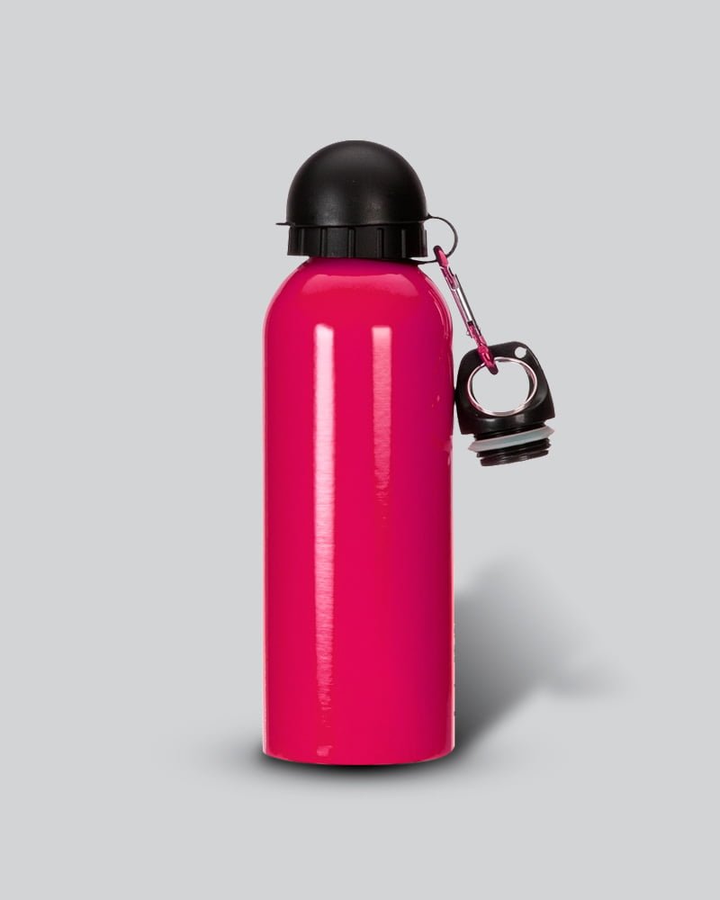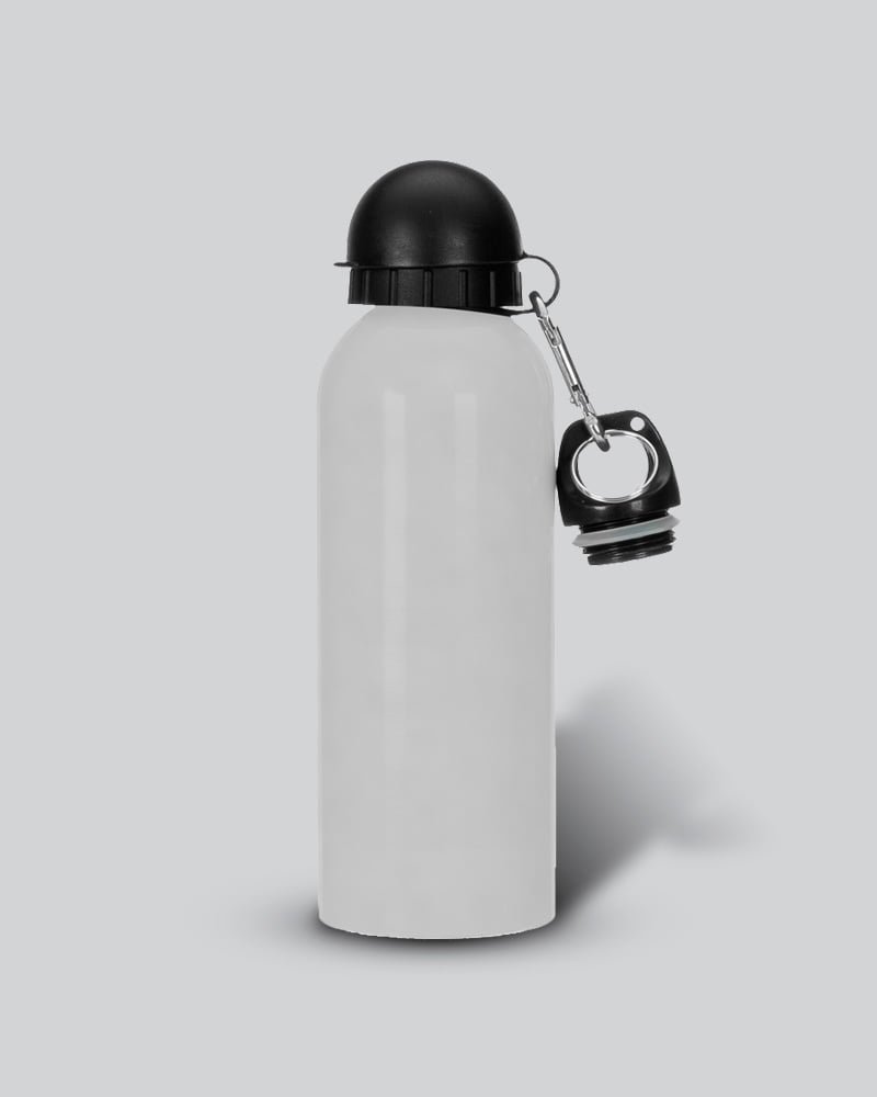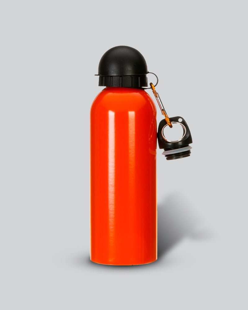 Squeeze 500ml de inox com pintura metalizada, tampa rosqueável e acompanha um segundo bico com mosquetão (não é térmico).
