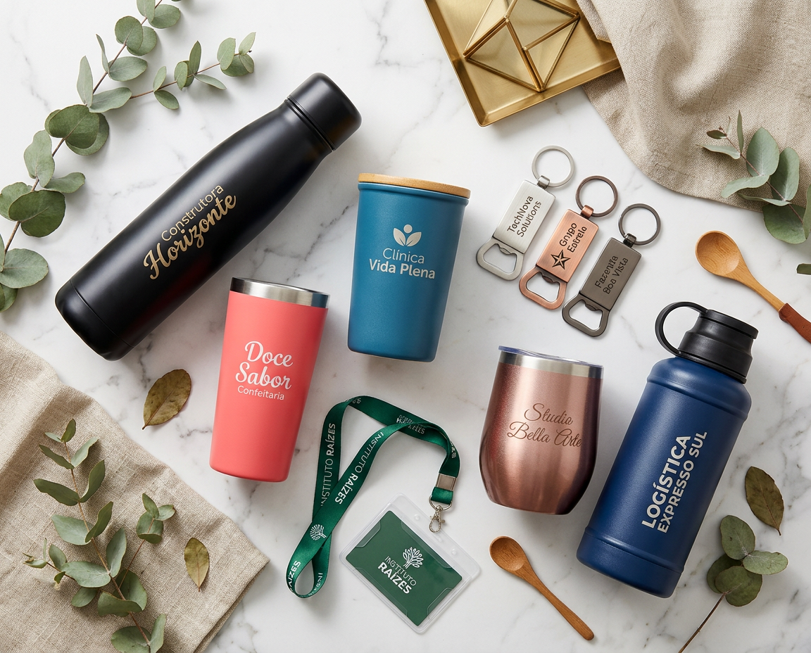 Trabalhamos com personalização a laser de alta precisão para um acabamento premium que valoriza cada detalhe.