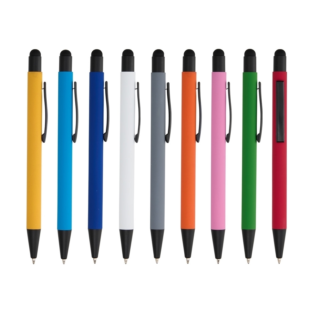 Caneta metálica touchscreen com acabamento emborrachado, acionamento por clique e carga esferográfica azul 1.0mm. Altura : 14,1 cm Largura : 1,4 cm Medidas aproximadas para gravação (CxL): 0,5 cm x 3 cm Peso aproximado (g): 17